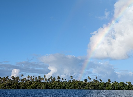 We do spend a lot of time opening and closing hatches as short 5-10 minute rain squalls roll through. But the reward is a beautiful rainbow dropping out of the clouds over a palm covered beach.