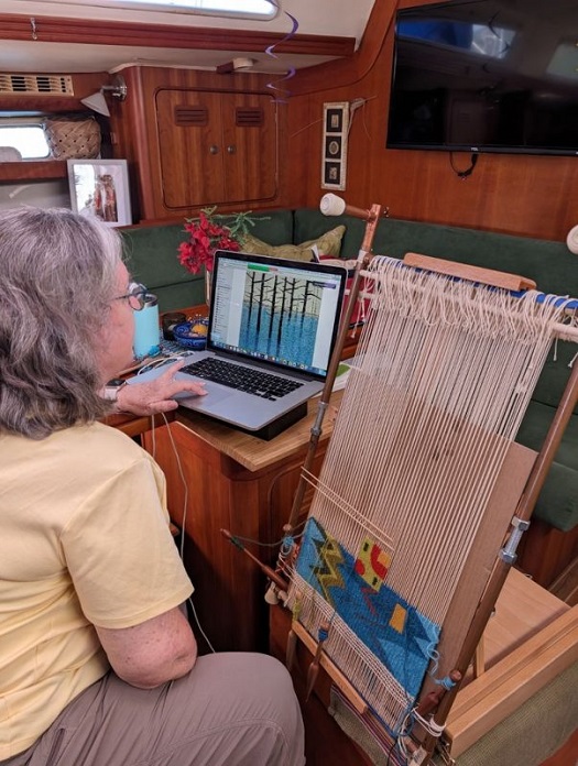 All of this has been about me. Brenda, on the other hand, always has a list of projects she is focused on. Today, as has been the case twice a month this season, she was teaching a class on tapestry to some of her more advanced students. She really enjoys it and has worked out the two camera system pretty well over zoom. This is a shot of her in “full battle gear”.