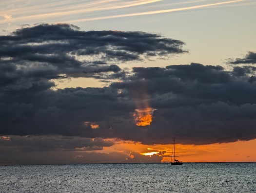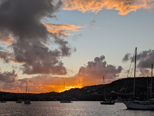 The anchorage is very well protected, open to the west but in the lee of the island. A beautiful sunrise nearly every morning.