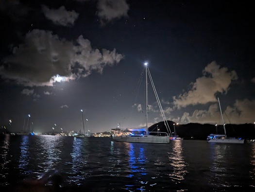On the way back to Pandora it was a beautiful night. Thanks to my amazing Google Pixel phone, a pretty good shot of her at anchor with a rising moon with blue LED lights bathing her mainsail with a glow.