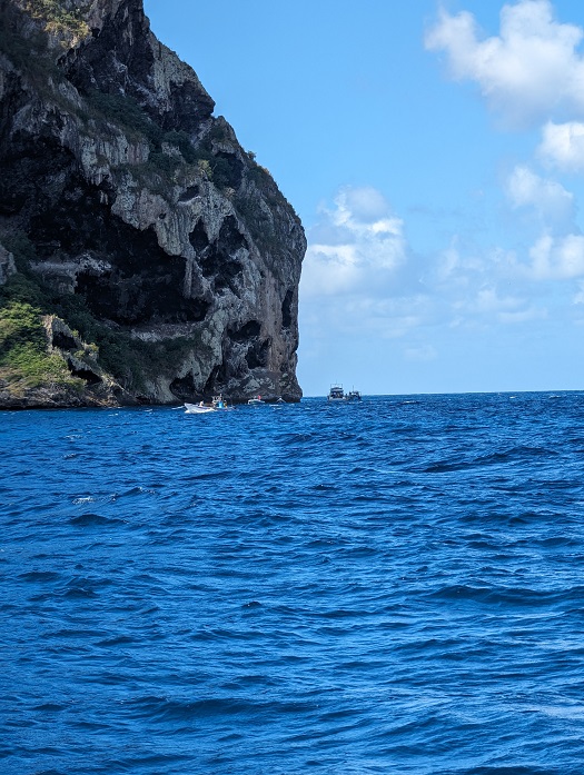 Along the way we passed an “island” if you can call it that. It is the cone of a long extinct volcano. Over the millions of years, the soft parts had washed away, leaving only the hard rock of the interior lava cone remaining. It is huge and quite intimidating to see the waves crashing up on it