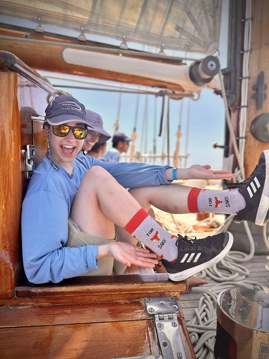 This young lady was a lot of fun. Her socks “for (fox) sake” brought a smile to us all. She was relentlessly cheerful and a lot of fun to have on board. My jib partner and marine artist, Anna Boulton took this great photo.
