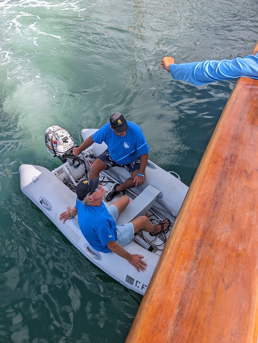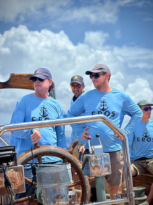 Eros has huge sails and fortunately, we had light wind for the first two days so we were able to learn more about sailing her when the loads were less. The most challenging part of sailing Eros is setting the “fish”, or what the fisherman sail is referred to, a large sail that is hoisted between the two masts. It is quite a handful and to get it hoisted smartly, takes 6-10 crew all working together. To watch Colin, the skipper, call out orders along with waving arms, reminded me of a conductor in an orchestra. I had sailed with him two years ago aboard Columbia when he was #2 on that boat.