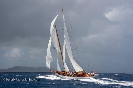 What a beautiful yacht. This photo, taken a few years ago by Beverly Factor, a professional photographer, is, I am told, owner Cameron’s favorite shot and the graphics on crew shirts are based on this photo.