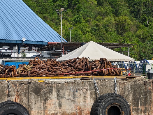 How about these piles of anchor chain? Each link is surely hundreds, more likely thousands, of pounds. I guess that they are used to anchor the oil rigs offshore as it is way to deep to have them sit on the ocean floor.