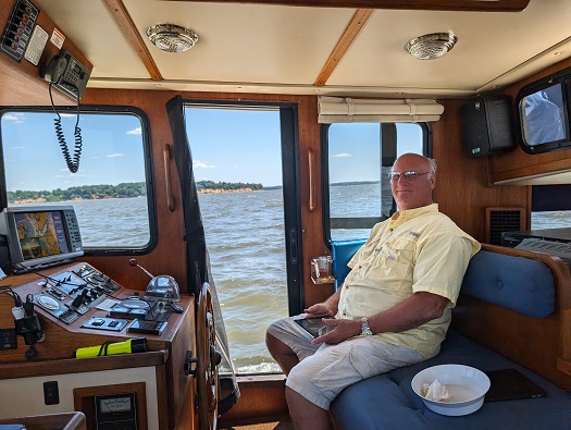 He seems pretty happy to be at the helm although some of the systems are still a bit of a mystery to him. We won’t dwell on our runup on a mudbank shortly after leaving the slip. No, we won’t talk about that. Spoiler: We got off and George is still smiling.