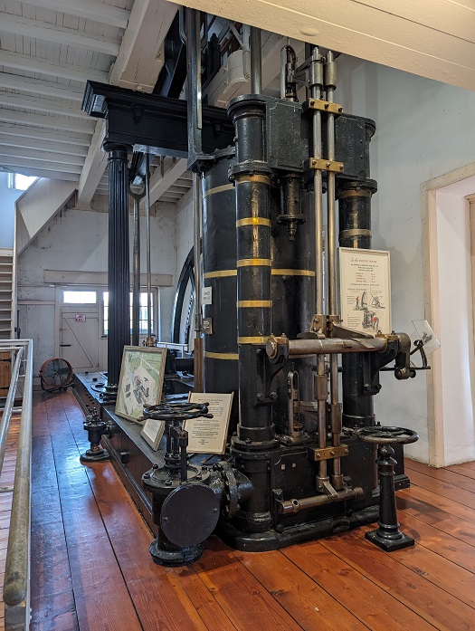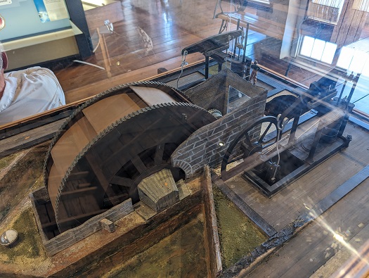 The two engines and water wheel combined take up three rooms. This small model shows the two steam engines that power the water wheel. The photo above is the left pump.