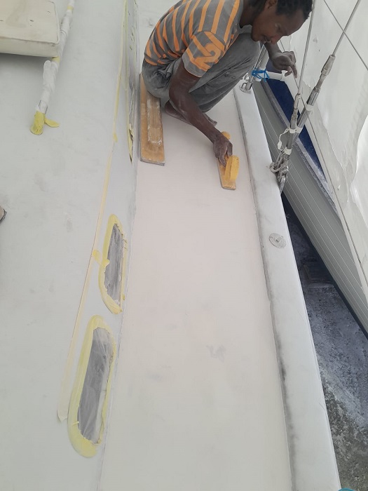 Since my last post the re-coring of the decks is done and the finish coats of epoxy are being applied after the area is fully leveled.