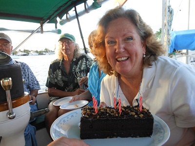 However, perhaps the greatest highlight for us here in Ft Lauderdale was a perfect celebration for Brenda’s birthday on Wednesday. We enjoyed a great dinner out looking over the the water. On top of that we visited friends for “sundowners” earlier in the evening and our hostess surprised Brenda with a cake. Doesn’t Brenda look happy? I have never met anyone who enjoys being a birthday girl more than her. Happy Birthday Brenda!!!