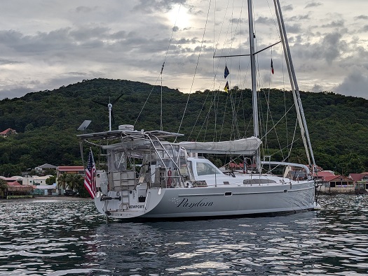 Pandora on her mooring in Deshais, as we returned from getting a few baguettes and croissants to tide us over on the run to Antigua, our final leg.