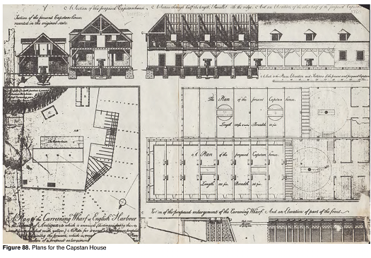 These plans are of the structure used to careen ships in English Harbor when the harbor was the headquarters of the Royal Navy.