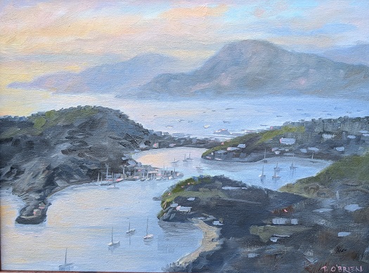 This piece, the third of three that he did, was painted high up on a neighboring hill, Shirley Heights, perhaps the best place to view the sunset in all of Antigua. In the background is Falmouth Harbor and foreground, English Harbor. When Patrick painted this piece, Pandora was on the dock, the left point of land in English Harbor.