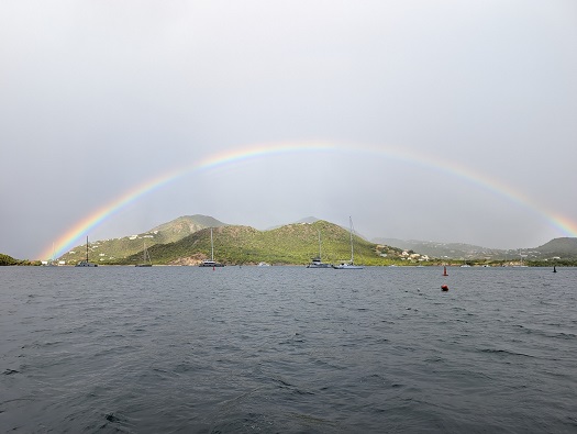 Oh well, no mega or even micro-mega yacht charters in our future but one thing that I can cling to is that their view isn’t any better than from the cockpit of little old Pandora. Yesterday we spent the day opening and closing hatches as rain showers passed overhead. And each time, leaving behind a beautiful rainbow.