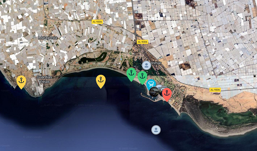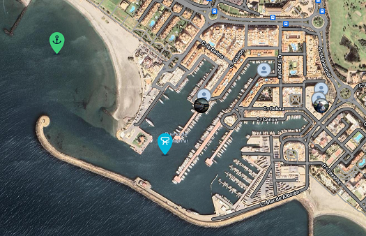 Each of the symbols mean anchorages, marinas and other features that you can zoom in on. This is a Google shot of Almeria, well part of the city.