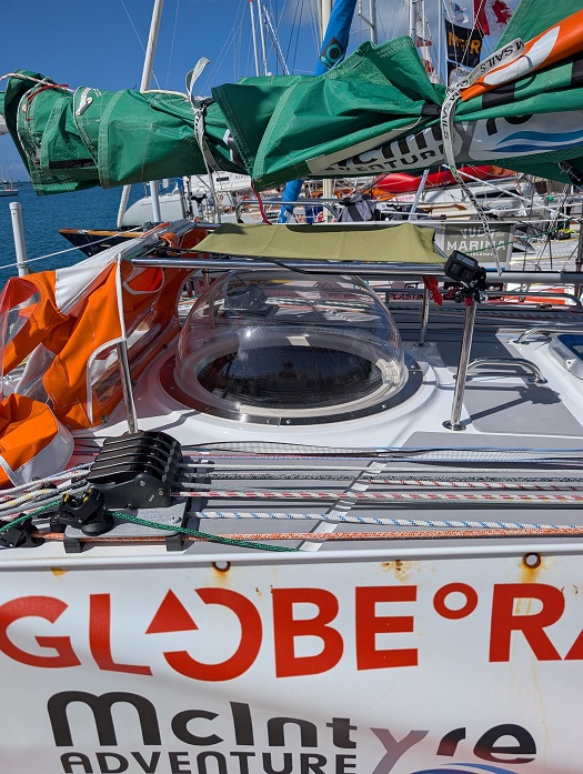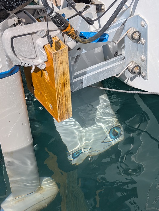With my own trans-Atlantic run to the Azores coming up, I continue to think about the threat of an orca biting off my rudder. These minis have a rudder as well as two dagger-boards on the stern, I guess for stability. I wonder if the “eyes” on these are to deter orcas or at least make them think twice about taking a chomp.