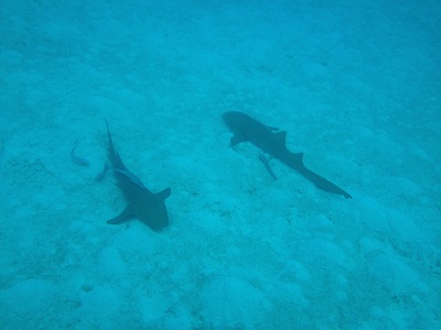 Speaking of “surf”. This morning was the arrival of two nurse sharks off of our stern. I just stuck my hand into the water off of the swim platform and got this shot. They look little but aren’t. I expect that they were about 4-5 feet long. They were having a nice nap it seems and were there for about a half hour. I wonder if Brenda will be swimming today? Perhaps her “encounter” with the ray the other day has made her more brave. Anyone want to place some bets on a swim today by Brenda?