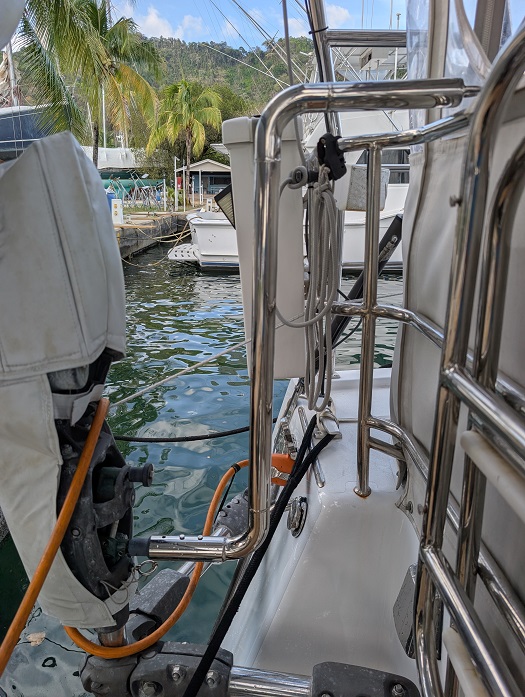 The idea is that If my primary steering fails I will be able to steer the boat and move the auxiliary vane tiller with lines connected to pullies on the radar arch. Well, that’s the theory. I hope that I do not have to test the theory in rough conditions. If it isn’t clear, it’s the S shaped handle. Lot’s of stainless around Pandora.