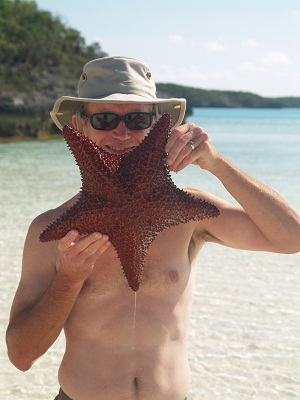 It’s Monday and we are still enjoying our time here in Big Major Spot.  Yesterday Brenda and I had an easy day of walking on the beach and wading in shallow water looking for shells.  While it’s still windy at 20-25 most days,(did someone say that the Bahamas are windy in January?)we enjoyed doing our beach combing on a windward shore, out of the wind.  Given the great popularity of this anchorage(there are over 50 boats in here and room for another 25-50, I expect)the beaches are pretty well picked over.  In spite of that we still found some nice little shells.  We also came upon a great starfish that was compliant and agreed to pose for a photo as long as we returned him to the water after the shoot.  Yes, this color is true, he/she was a brilliant red.  Amazing.