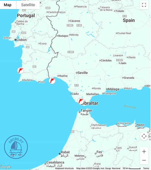 Early in the spring the risk of attack in the area near Gibraltar and southern Portugal is at it’s peak but as the season progresses, many of the orcas move north, following the tuna, up the coast of Portugal so the threat on the south coast of Portugal and near Gibraltar is less during the summer months.
