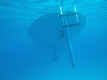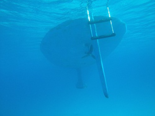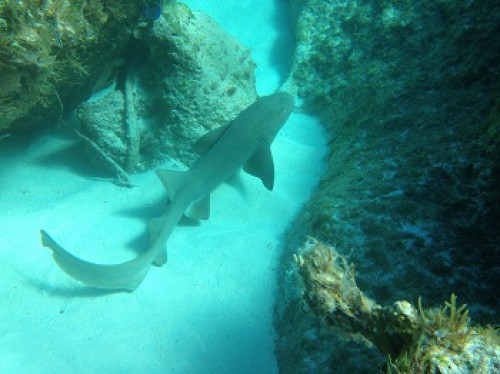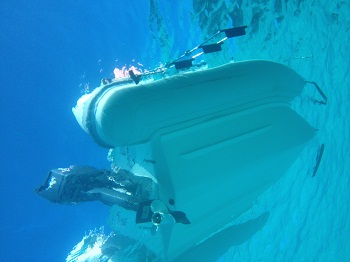 This is our dink when viewed from a less common angle.  That’s clear.  As soon as we dropped anchor in nearly 20′ of water I looked over the side to see a school of fish swimming by followed by a ray and then a large puffer fish that was looking for a handout.  It was like Wild Kingdom.  What a spot.   Speaking of less common views.  How about this one of Pandora.  While it doesn’t show here, I could see the anchor chain and anchor from here.The crescent beach was nearly two miles long and was an unbroken snow white sort that you dream about.The snorkeling was great too and I was thrilled to swim with my first nurse shark, I guess about 4′ long.There are loads of fish on the reefs.  It’s great fun taking photos although they never look as good as the real thing.  The colors are more vivid than the photos show.The scenery was quite dramatic with great white cliffs around much of the island.