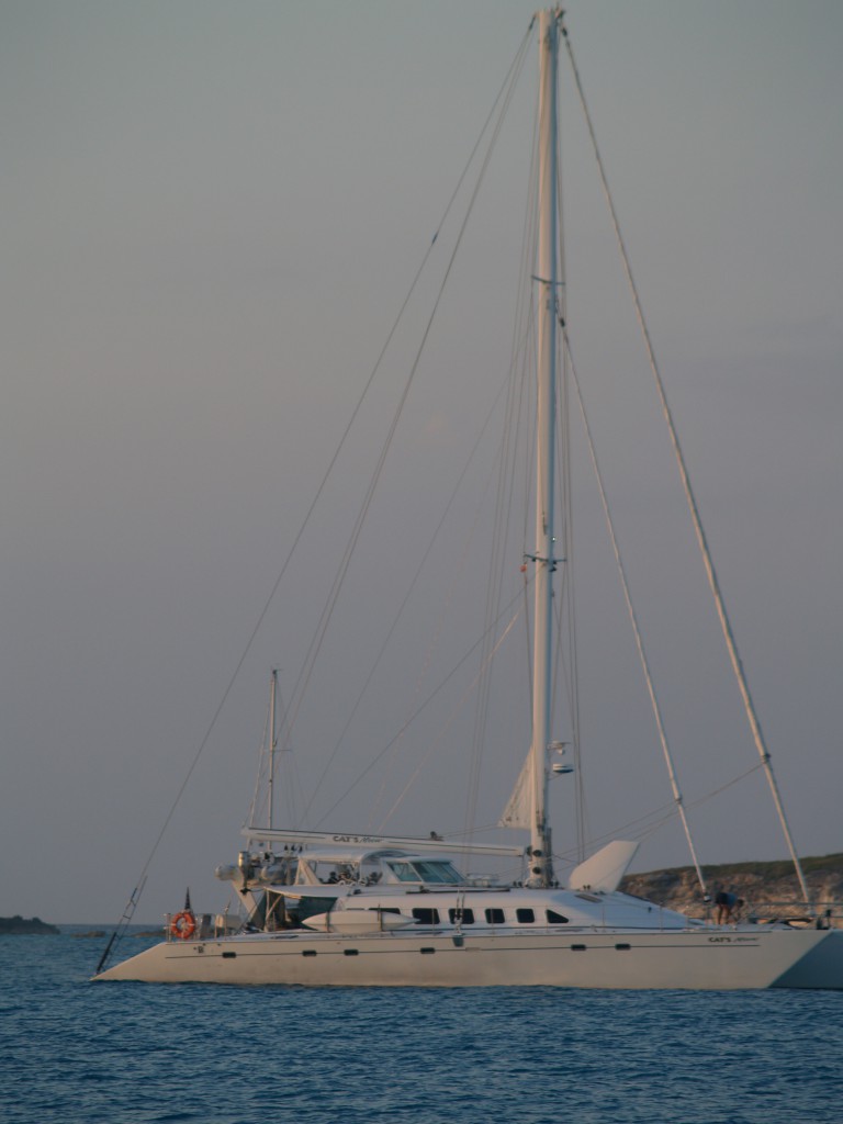One evening we were invited aboard a massive cat, nearly 80′ long for cocktails.  The owners were very gracious and told us all about Rum Cay, a place that I had wanted to visit for a while.  This is a really big boat.  Just one of the hulls could swallow up Pandora and one of her sister ships. Since we have arrived in the Bahamas we have been able to time our trips with the winds and avoid long motor passages.   With pretty nasty weather in the forecast for later this week we had to find a harbor with protection from north west winds, something that is not common in these waters where most harbors are wide open from that direction.