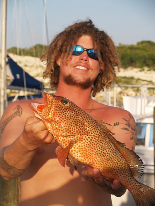 Some of the guys go out spear fishing every day and always come in with something to show for their efforts.   This lobster looked really big to me but I am told that they find some that are even bigger on a regular basis.  I think that I’ll have to give that a try.How about this strawberry grouper?  One of the guys told me yesterday that he had been chasing a really big grouper, perhaps 20-30 lbs but couldn’t get close.  I wonder how you would even get a fish back to the boat before one of the reef sharks showed up to claim the prize.  Perhaps I don’t actually have the guts to try.  Probably not.There is an interesting mix of folks here from all walks of life.  A young couple arrived yesterday on a small 32’sailboat.  They are married and both crew on a salmon fishing boat in Prince William Sound in Alaska in the summer.  For the winter they are sailing the Bahamas   At 22 and 26 they are really youngsters.  The women, more of a girl actually, Tonya, the younger one, is very petite and it’s hard for me to imagine her working on a fishing boat.  It seems that she grew up aboard their parent’s boat while they sailed around the world.  She “joined” the crew in Cypress when she was two months old and was aboard as they completed the rest of their journey.