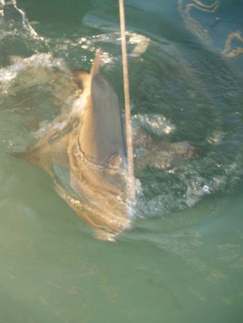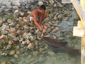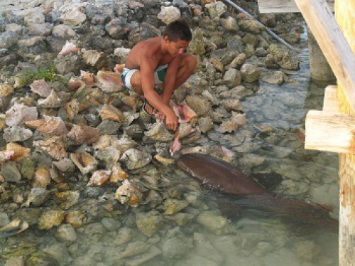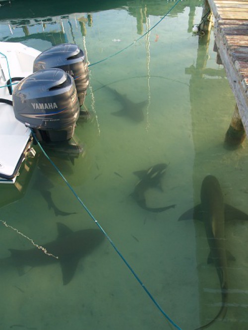 I was also told that bull sharks are common here.  While nurse sharks are harmless, the lemon and bull sharks bite plenty so you want to be sure to stay away from them. The cruisers who were feeding them made quite a sport out of it by tying a fish head to a rope and teasing the sharks.  It’s sobering to watch one of these lemon sharks take a swipe at the fish bait.   It happens so fast that your eye can’t even follow it when the strike occurs.One of the local kids enjoyed putting a piece of fish just out of reach of the nurse sharks in really shallow water so that they had to practically swim out of the water to reach it.Swimming anyone?  Note moi, that’s for sure.