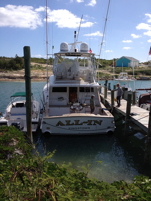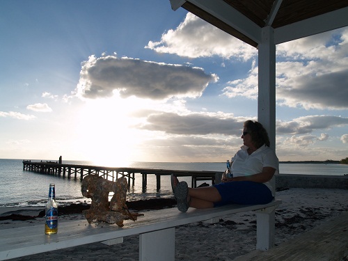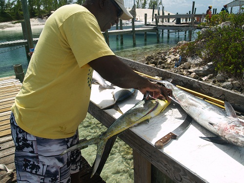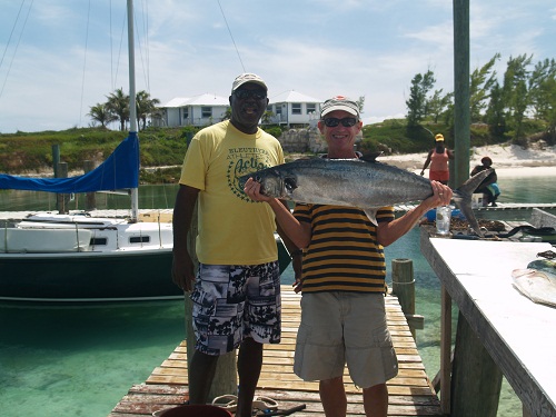 Last evening, Brenda and I walked down town, such as it is, to enjoy a beer on the beach overlooking the government pier while the sun set.  What a view.On our way back we spied this lovely sunset as we got close to the marina.  If this was a painting, you’d likely say that it looked fake.  Nice fake, if you ask me.Yesterday I was invited to go deep fishing with one of the locals.  Ben, who is the paid captain of this massive sports fish boat, watches it for a wealthy lawyer from the states who almost never uses the boat.  Quite a vessel.  Ben and I went out on his boat, the one on the left.  I doubt that we could have afforded the fuel for the big one.  Yikes.  Actually, with fuel here on Rum Cay at $8 a gallon, I can’t afford it here either.  It has to be brought to the island in 50 gal drums, I am told.  Not very efficient.    Ben captains the boat on the right.  Alas, we fished on the one to the left.  I doubt that I could have even afforded the fuel to get the big one out of the marina.  We had a great day of fishing and bagged a Mahi Mahi, and a big King Mackerel.  The Mahi Mahi gave quite a fight including some spirited leaps into the air.
