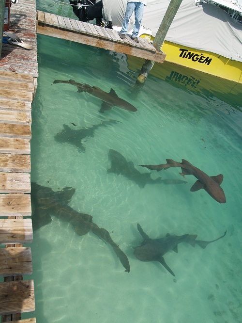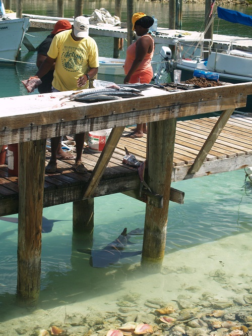 The King was like reeling in a big log that pulled like mad.  The one that got away must have been huge as it seemed much more powerful than either one that we boated.Ben did a masterful job of cleaning the fish.  His knife was sharper than anything I have ever used.  I doubt that I have a knife aboard Pandora that could have tackled something as large as the King.The sharks appeared out of nowhere as if in cue to pick up the scraps.  I counted eight at the peak of the cleaning process.  I’d hate to land in the water and be mistaken for a piece of bait.  Compared to these monsters, that’s all I’d be.   The biggest run over 8′ long. Fish cleaning is a very public affair attracting all sorts of attention both on and below the dock.Last night we had sauteed Mahi Mahi for dinner and Mahi Mahi fish burgers for lunch today.   Brenda did a great job on both.   And, we have 4 huge King steaks in the freezer.  Good thing as our freezer isn’t totally packed any longer.   Tonight we will have grouper as I went spearfishing with a guy from the marina today and he speared two.