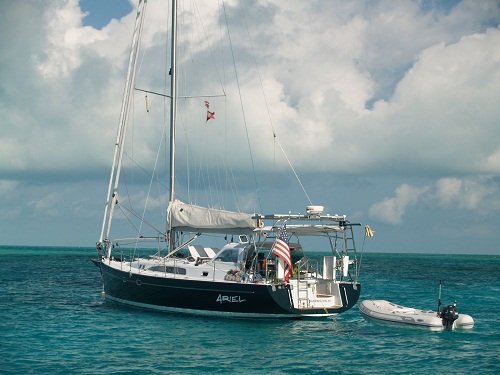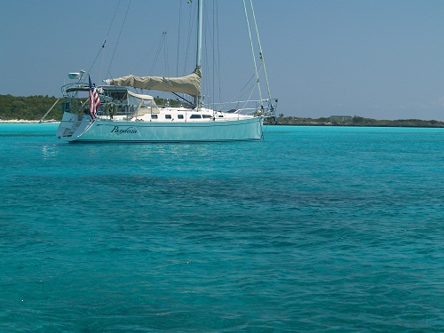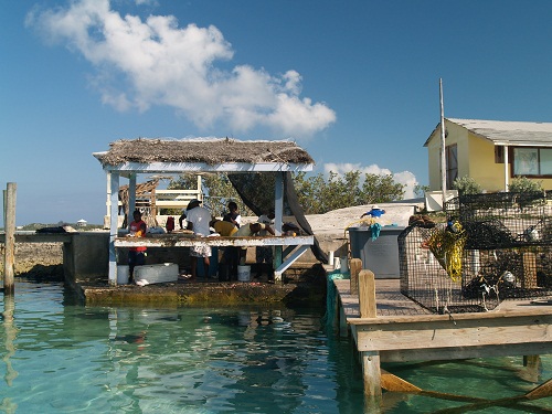 I climbed up on Pandora’s radar arch and took this shot directly down into the water.  Can you say blue sparkly?This is what it looked like forward.  Up ahead, that’s Ariel, the Aerodyne 47 we have been sailing with for the last few days.   Ariel, home to our friends Miles and Loreen, is a remarkable boat and one that can always beat me, even if she is only a bit faster.  Having said that, she is in different league and is perhaps the only boat I’d trade Pandora for.  Unfortunately, I’d have to have two of Pandora to make the trade about equal.    She’s fast and elegant.  I always look for ways to photograph Pandora looking lovely in her native environment.  This view is a particularly fetching one.    Even Pandora appeared to be a lovely blue. And just off of our starboard beam, the Little Farm’s Cay Yacht Club.   The proprietor has a great name, Roosevelt Nixon.  He’s a very nice guy.   I love the colors that buildings here are painted.  Very bright and fun.  In our little New England town,  the “decorum police” would burn the place down overnight if we painted our home this bright a color.   Here, it works.To get the most out of the day we spent several hours looking for shells on nearby beaches and came back with a spectacular haul.   After that Brenda and I toured the harbor enjoying the sights.  The community fish cleaning station was pretty busy.  These guys had speared a few large groupers and were happy to show off their catch.
