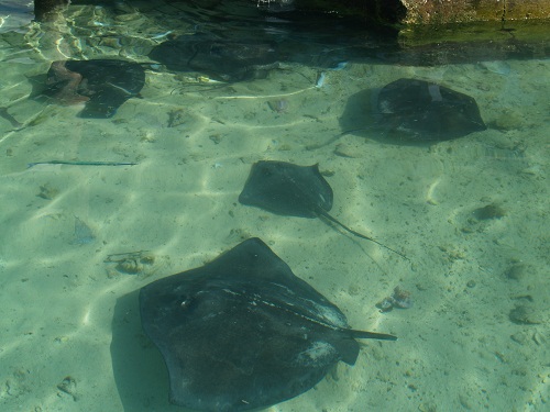 Some large rays were happy to pick up the scraps.  Interestingly, unlike Rum Cay, where the cleaning station attracted all manner of sharks,  rays were the only “locals” eager to clean up.  These rays don’t look that big in this shot but they are up to 4′ across.This cute little guy seemed to be enthralled by the action in the water below.