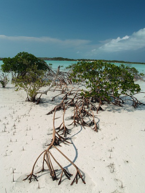 On Monday, after a terrific Easter Sunday celebration pot luck at the park warden’s home with perhaps 50 or so other cruisers, we headed over to Shroud Cay, another island in the park but one that is primarily a mangrove swamp. There are channels meandering through the mangroves with water, at least at high tide, that is impossibly clear. The roots of the mangroves make the most amazing sculptural sight. The ariel roots help the plants roots get enough air and help excrete excess salt. These are very tough plants and are critical to keeping islands from washing away in storms. In fact, mangrove swamps are a great spot to tie up a boat to avoid a hurricane as they are very solidly rooted and you can tie up to them and be safe from a storm. They also break waves and keep wind down. Me, I am not planning to test this out any time soon.