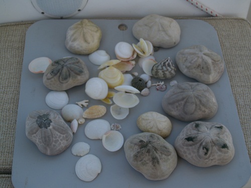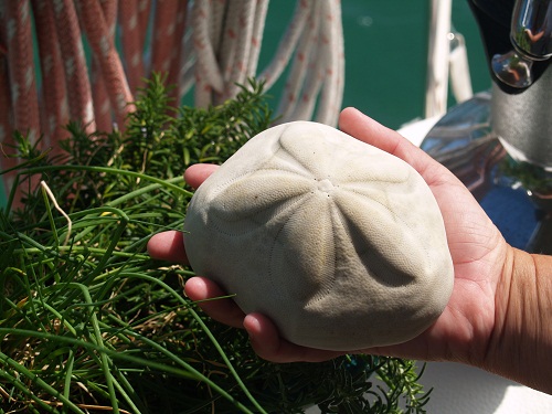 For the last two nights, since our arrival, we anchored near one of the nearby beaches, a very pretty spot. Yesterday I headed ashore to check out the local beach as a possible shelling spot. Given the popularity of the beaches in this area, I wasn’t expecting to find anything. However, after a few minutes, I realized that it was a GREAT SPOT to shell and headed back to Pandora to get Brenda. We returned to the beach and after less than an hour we had a great haul of shells including nearly a dozen sea biscuits, a sort of sand dollar. There were many scattered around the shallows at low tide. The live ones are black and are covered with little spines, sort of like a sea urchin. When they die, the spines fall off and what’s left is a white skeleton. They are very pretty. The ones that we picked up are still a bit dirty looking but a bit of bleach and some time in the sun will make them look much better.