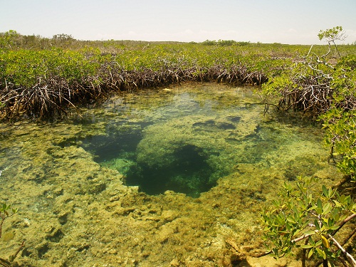 As you may recall, prior to our arriving in Marsh Harbor, we spent a few days in Little Harbor.  While we were there we went for a walk and visited a small blue hole that someone had told us about.  A blue hole is a salt water pond where the water has worn away the limestone rock and connected the hole to the ocean through an underground cave which might be a mile or more away.    As a result, as the tides rise and fall, the water in the blue hole rises and drops too.  These holes can be miles from the ocean and yet have a connection so that fish can swim from one end to the other.    One of the blue holes in George Town is reputed to be over 5 miles long from the “hole” to it’s ocean source.