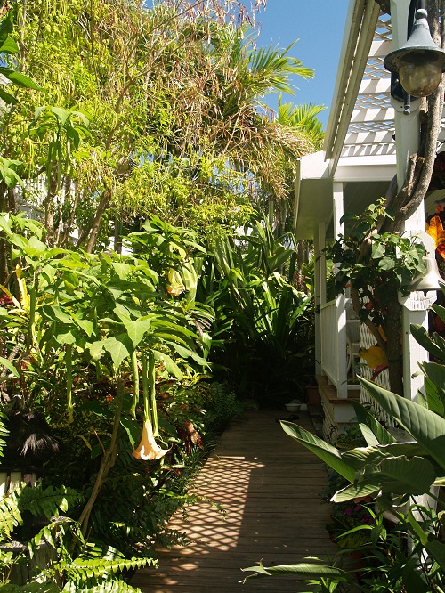 This was a particularly lovely walkway on someone’s property. The large pendent trumpet flowers are datura. Really impressive flowers. Some folks in the US grow them as a summer patio plant. Here, they grow well year round.