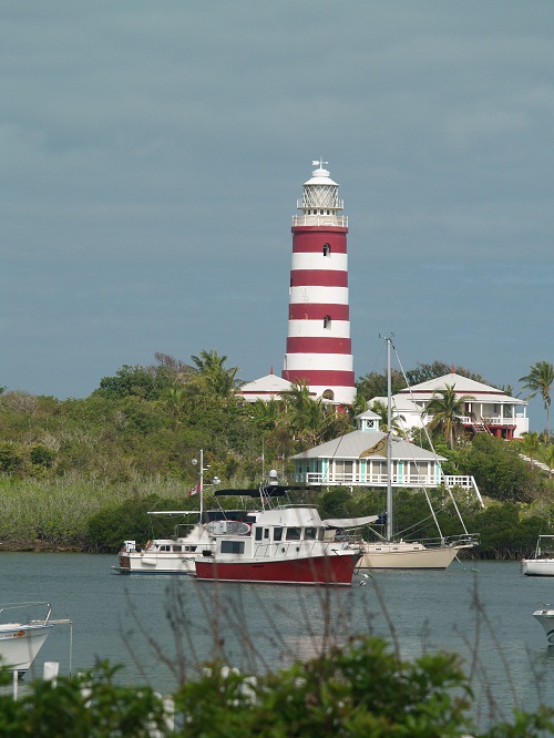 The light stands like a candy striped sentinel over the harbor. It’s the tallest thing in the area, higher than even the BATELCO cell tower. This view, from town, shows just how big this light is relative to the low islands of the Bahamas.