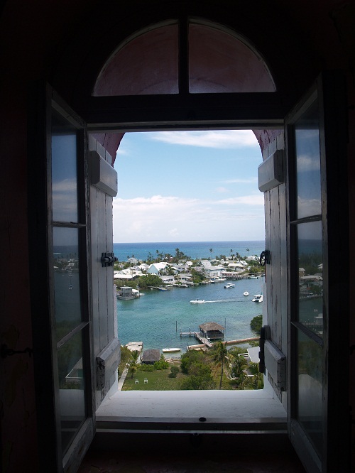 As you descend that wonderful spiral, there are a number of windows with great storm shutters and fabulous views. Can you imagine what it would be like to stand in front of this window when a hurricane is blasting through town? Good thing that the wall thickness is measured in feet instead of inches.