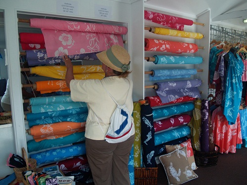 Brenda was particularly excited about coming here because the island is home to a store selling batik fabric from a company called Androsia and we were told that this store is the largest distributor for Androsia. These fabrics are died and patterned by hand in a shop on the island of Andros, an island that is not on our itinerary for this year. (Andosia from Andros? Get it?)