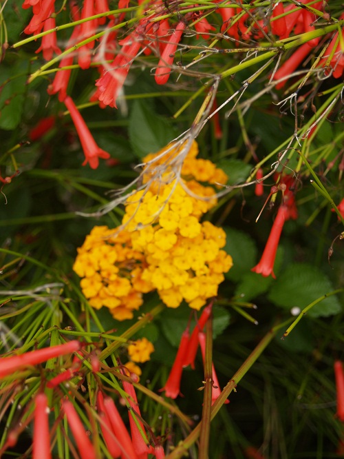 These red flowers are on a bush that is trimmed into a sort of feathery hedge.