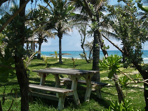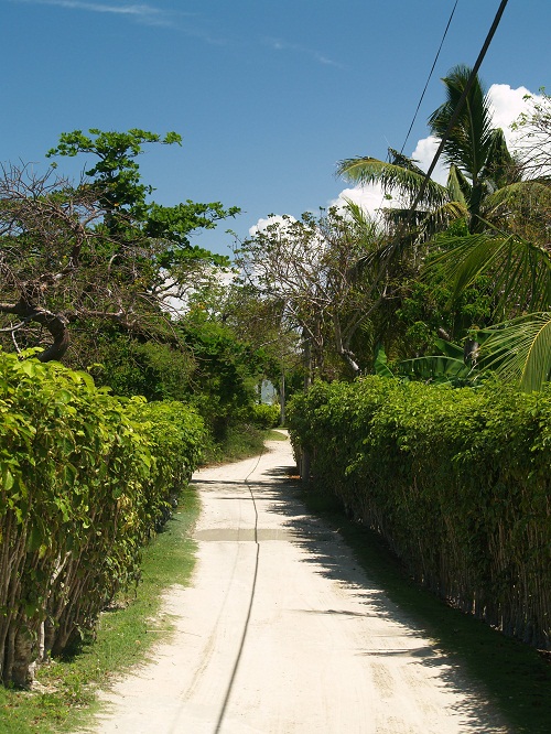Well, enough ranting about that. The coastline of Elbow Cay, where Hope Town is located, has some really nice homes and we enjoyed walking by them yesterday. The north area of the island does not allow motor transportation beyond golf carts and that’s only for those who are residents of the island. That keeps the dirt roads, sand actually, clear of unnecessary traffic and makes for a great place to spend a few hours walking and enjoying the sights. As I have mentioned before, the Abacos are more lush and green than the southern parts of the Bahamas and now that we are into the spring “wet” season, things are really looking great. Pruned hedges, or trees, are a very popular visual break along some of the homes here. This shot shows how lush things are here. There’s even grass.