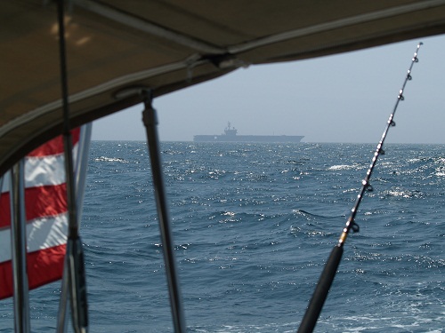 Speaking of massive chunks of steel that can go bump in the night, or day for that matter , none can rival an aircraft carrier for shear bulk. For two days this ship was conducting live fire expercises in the area where we were traveling. To see something this big come out of the haze was a spectacle to behold.