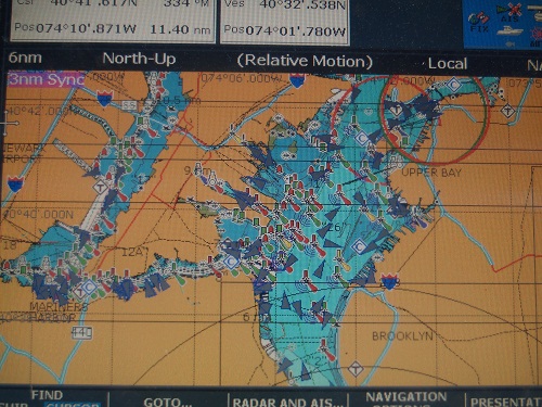 This shot I took of the plotter screen when we were going through NY shows just how many ships there are in the harbor. It’s a busy place. Each of the black triangles are the coordinates for particular ships as they show up on AIS a location monitor system for ships, like the air traffic control system is for commercial aircraft. That’s a lot of shipping vying for space in a busy area of water.