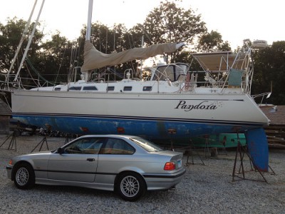However, a week later with about a quarter of the bottom remaining to be sanded, look how much bigger she looks next to our SAAB, a much larger car than the BMW. Hmm… I think that Pandora really IS getting bigger.What’s happening?