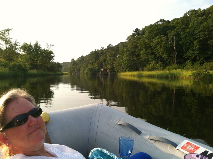 Brenda looking pretty relaxed in the bow of the dink. Happily, we had a few cushions for her to sit on.