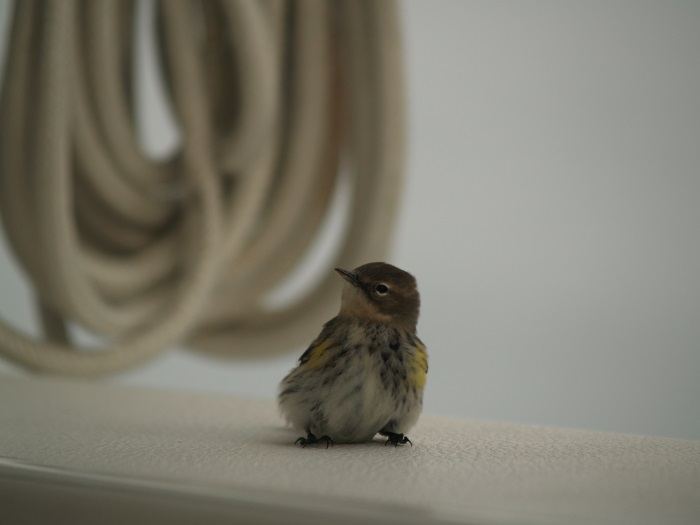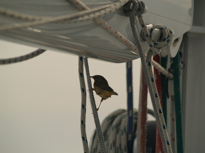 For much of the time, one of them hung out on up forward and a few times he even came into the cockpit, out of the wind and rested. To see this little guy some three feet from us on the cockpit combing cleaning his feathers was amazing. Funny how safe he seemed to feel in spite of the unfamiliar environment.  I guess if you are tired enough… It will be interesting to see if he’s still with us when it gets light.  With sails coming down and going back up, I expect that we shook up his world pretty well.