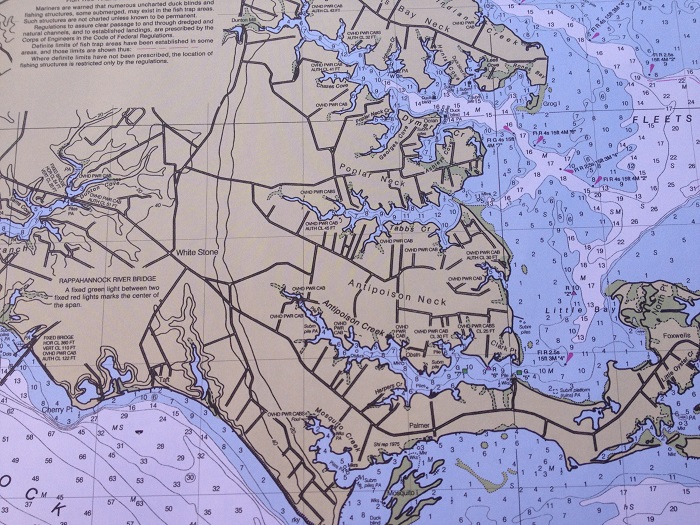 Our spot for the night, Ashley’s Cove, was very well protected with a really tight entrance. There was barely enough water for us to make it in but then it opened up into a nice little peaceful spot. Holding was good in soft mud. Ashley’s is off of Fleet Bay just north of the Rappahannock River in VA. Try saying Rappahannock three times fast. Rapp….