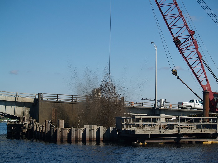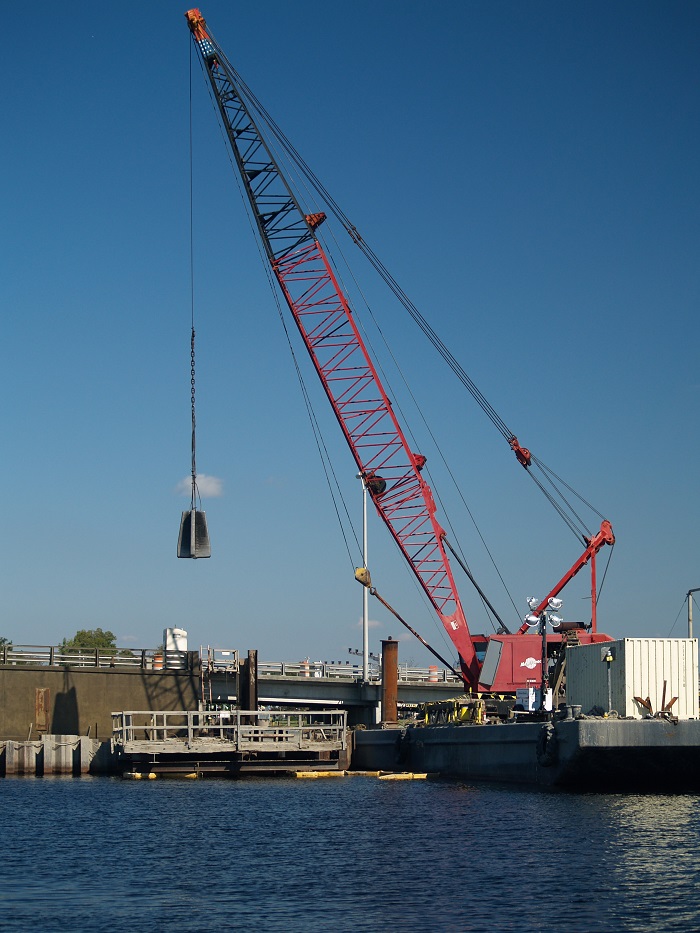 As we came through the lift bridge into Elizabeth City we were treated to a display of perhaps the greatest “big boy toy” I have ever seen. A massive crane that was dropping this huge metal thing into the water, over and over again. It seems that they are crushing an old bridge foundation. Here’s the crane preparing for a “drop”.