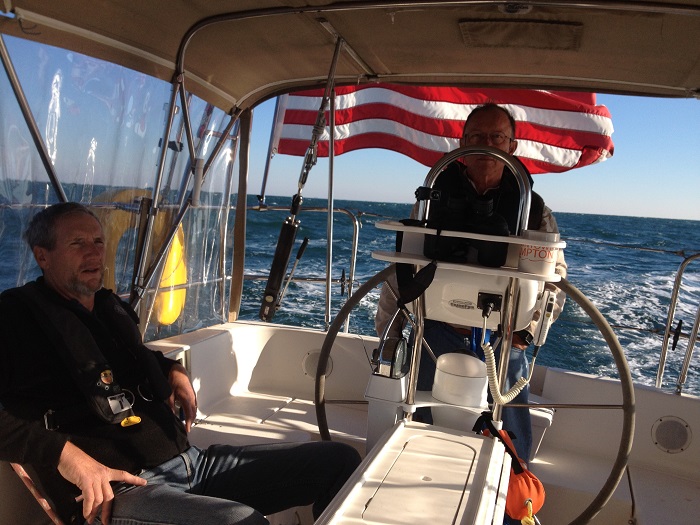Here’s a shot of John and Bob, both who have much more offshore experience than I do.   This shot was taken the first day out before it got really interesting. Yesterday morning we entered the Ft Pierce inlet and were headed down to Nettles Island Marina, where I had made a reservation to keep Pandora until mid January when Brenda and I will head down to Miami and onto the Bahamas.