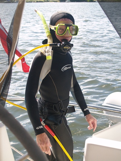Perhaps I’ll get lucky and he will call me early in the AM and stop by to scrub the hull.  If not, I’ll just have to do it myself.   Here’s a shot of me with all my gear from last year, about ready to clean things up.  Pretty amusing look, if you ask me.However, the water here in the marina isn’t nearly clean enough for me to risk a swim so if I have to do it myself, I’ll wait till we are out in more clear water.  It’s pretty easy to clean the hull as I just use a scotchbrite pad on a plastic handle.  It’s not that bad as long as the fouling isn’t too bad.
