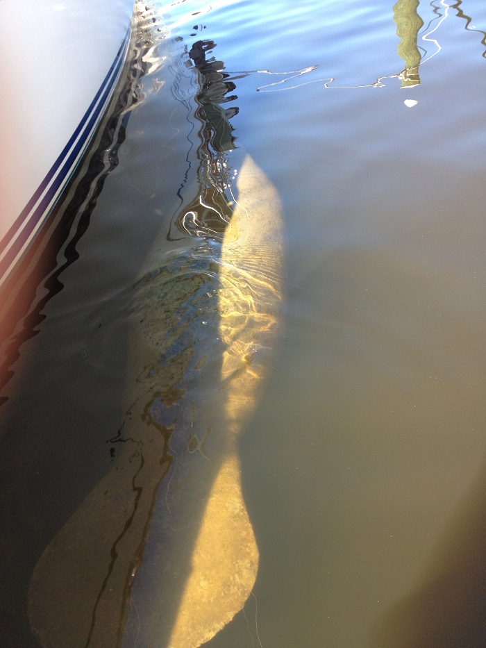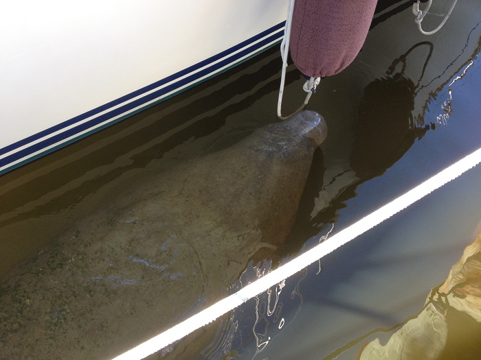 Here in the marina the water is pretty murky but there is lots of wildlife.  This manatee swam right by Pandora twice today.  Well, that’s how many times I saw her/him.   Not too pretty looking.  Supposedly, early explorers mistook these guys for mermaids.  They must have been pretty lonely to have mistaken one of these “sea cows” for nautical beauties.   This shot shows pretty clearly the whole deal.  They are about 8′ long.  This guy’s back was completely covered with algae too.  Not the spic and span skin of a dolphin and plenty sluggish swimmers.  No wonder they get struck by power boats so often.  Amazing creatures. And, these guys aren’t the only wildlife in the area.  There is a mangrove stand near the fuel dock that is the evening gathering place for hundreds of Ibis birds and a few pelicans.  In the dark the white birds look more like litter sprinkled on trees.  It’s amazing to watch them fly in from all over as the sun sets.  And, this pelican was perched on a piling in the marina just outside of the bar area.  I wonder if he was looking for some fish and chips.  It’s funny, but to me pelicans look pissed off.  “hey bud…who you lookin at?  Yes, I’m talkin to you.”Well, the plan is to head out early or, if we are lucky, to have the diver clean the bottom of Pandora to get off three months of slime before we head out.  I guess I’ll have to see if the diver calls me back first thing.
